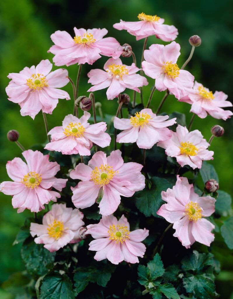 Large, semi-double, pale pink, cup-shaped flowers with yellow centers, blooming late summer to autumn on tall stems above dark green foliage, perfect for adding height and color to partial shade, though it spreads vigorously once established and may need containing.