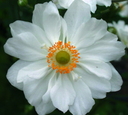 Vigorous, clump-forming perennial about 90cm tall, 3-lobed mid-green leaves, and semi-double to double white flowers 6cm wide, with narrow, slightly rolled petals, several outer petals are green, and a central boss of yellow stamens, from late summer to late autumn.