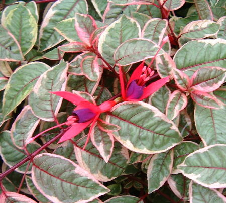 A low-growing, deciduous shrub to 50cm tall and wide with variegated foliage comprising green leaves edged with cream and shades of pink and red. Single pink to purple flowers are borne from summer into autumn