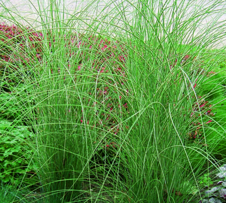 Morning Light is a compact deciduous perennial with narrow leaves finely edged with white, and pink-tinged panicles of flowers in autumn.