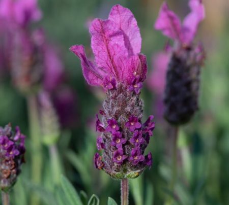 A compact, mound-forming, evergreen shrub with upright stems bearing linear, aromatic, grey-green leaves, and, from late spring to early autumn, dense spikes of tiny, fragrant, dark magenta flowers topped with conspicuous, bright pink bracts.
