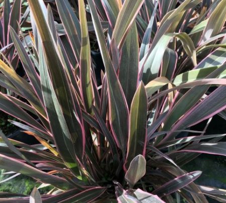Phormium Pink Stripe is an evergreen, clump-forming perennial growing to 2m with broad, leathery, strap-shaped leaves. It has one or more pink stripes along the edges. Mature plants may produce clusters of dark red flowers on upright stems in summer.
