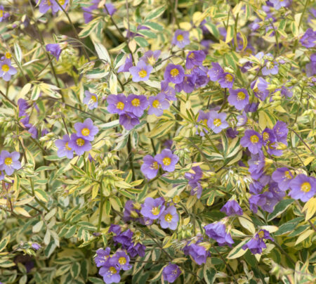 A bushy, clump-forming variegated perennial to around 50cm high, forming a low mound of variegated, pinnate leaves, divided into dark green leaflets with golden yellow margins which do not revert back to green. Clusters of lilac-mauve bell-shaped flowers appear on long, upright stems in spring and early summer.