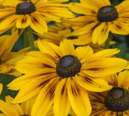 A short, stocky variety with flowers appearing in the summer. Petals are a golden yellow with a dark brown centres. Ideal for pots or containers and also for smaller gardens.